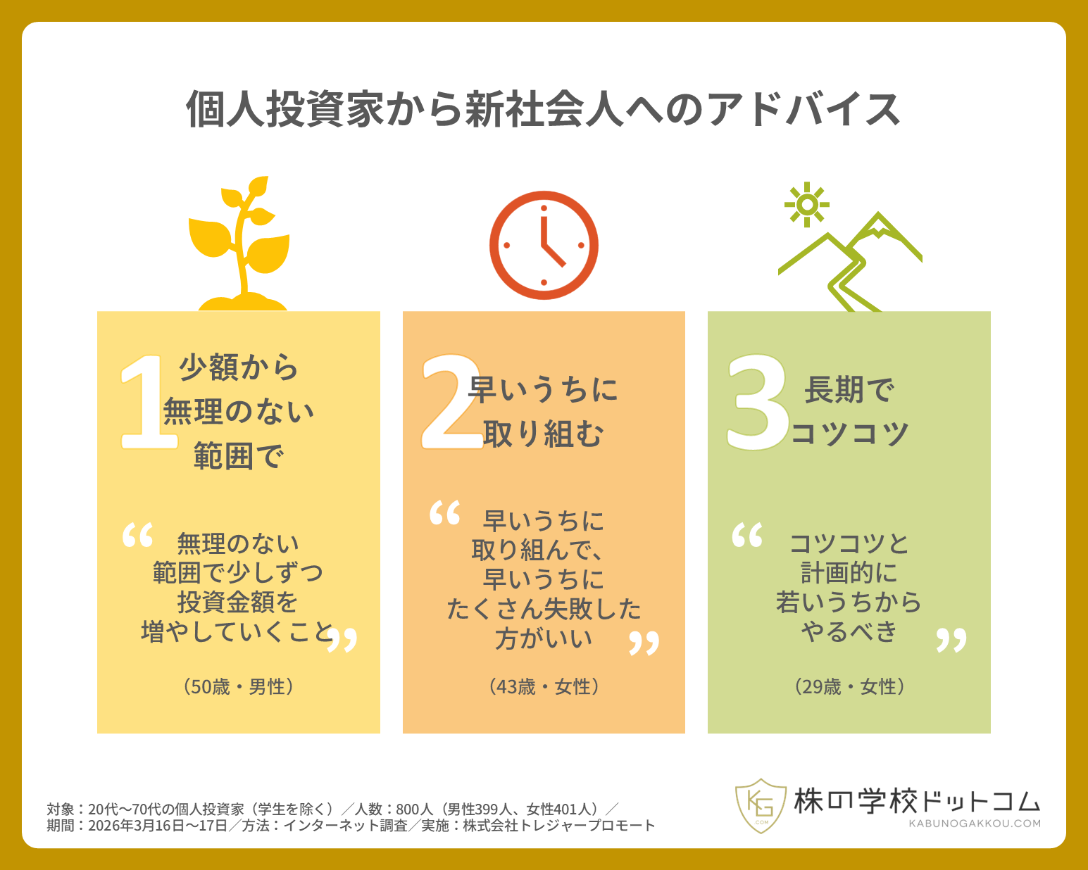 ◆ 個人投資家からの新社会人へのアドバイスは「少額・早期・長期」