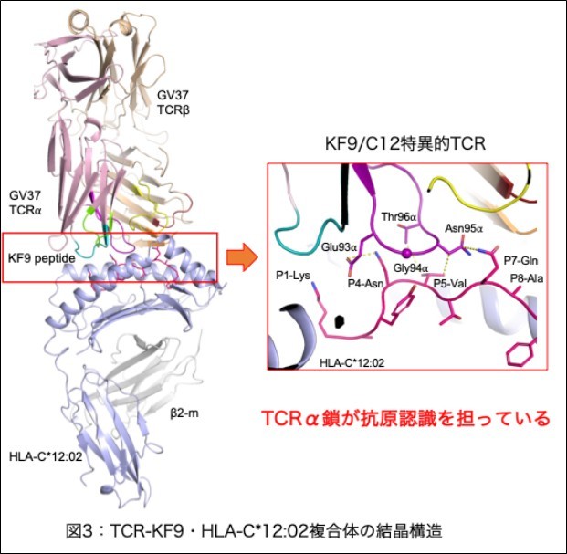 さらに、KF9/C12特異的T細胞からT細胞受容体を同定し、機能的に優れたT細胞に備わったTCR-抗原ペプチド・HLA複合体の結晶構造解析を行いました。その結果、TCRα鎖とβ鎖がそれぞれ抗原と相互作用するという通常の認識様式とは異なり、TCRα鎖が主に抗原の認識を担っているという特徴を明らかにしました(図3)。