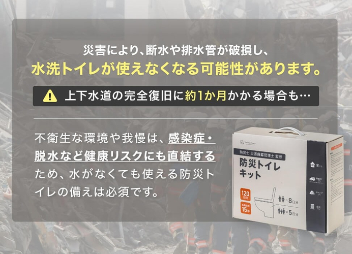 地震や豪雨などの災害発生時には、断水や排水設備の破損により、自宅や避難先で水洗トイレが使用できなくなる可能性があります。