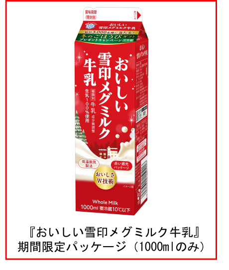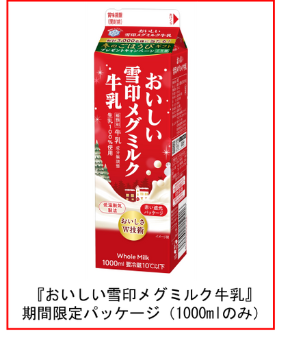 さらに、キャンペーンに合わせて、11月上旬から12月中旬頃まで(予定)、『おいしい雪印メグミルク牛乳 1000ml』は、クリスマスをイメージしたパッケージで展開します。