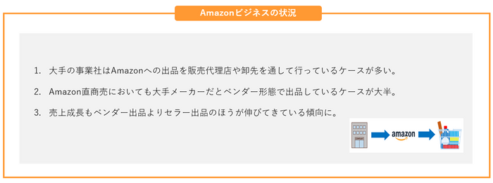 ② 特にAmazonに関しては商売形態上、販売や運営自体を卸先や代理店に任せているケースも多い。そのためノウハウやデータの蓄積も難しい。