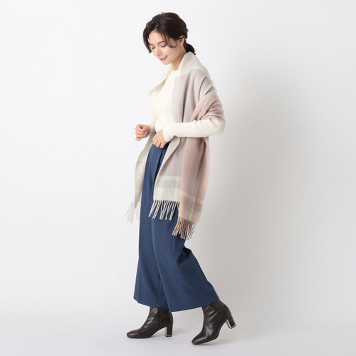 カシミヤ100%ならではの暖かで軽やかさでまといやすく、淡い色のグラデーションが、お顔まわりをフェミニンに格上げ。