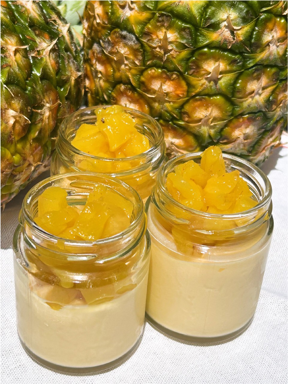 隠し味にパイナップルリキュールを加え、 南国の爽やかな香りとほのかな甘みを演出したとろける食感のプリン。添えたパイナップルのコンポートは、完熟パイナップルをじっくり煮詰めたもので、甘酸っぱさがプリンのまろやかさと絶妙に調和します。