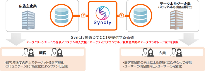 これを受けてCCIは、異なる企業間のファーストパーティデータをプライバシーに配慮した状態でデータ突合し、顧客解像度の向上を可能とするマーケティング施策特化型データクリーンルームサービス「Syncly」を提供いたしました。データクリーンルームの導入支援やカスタマーサポートに加えて、広告のプランニングやマーケティングの支援までを一気通貫で実施いたします。