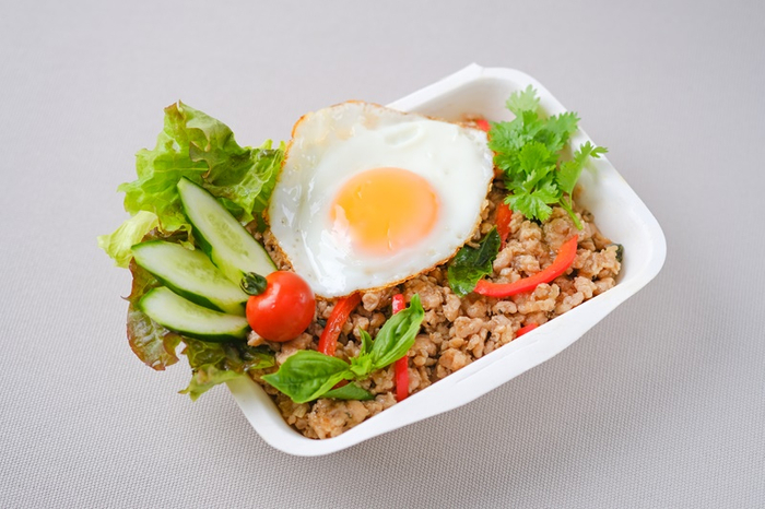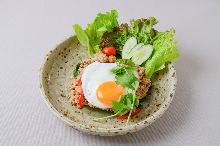 ガパオ専門店ならではのこだわりで、メニューによって牛、豚、鶏と最適な挽肉を選びました。濃い味のガパオに負けない味の強い卵をお楽しみください。