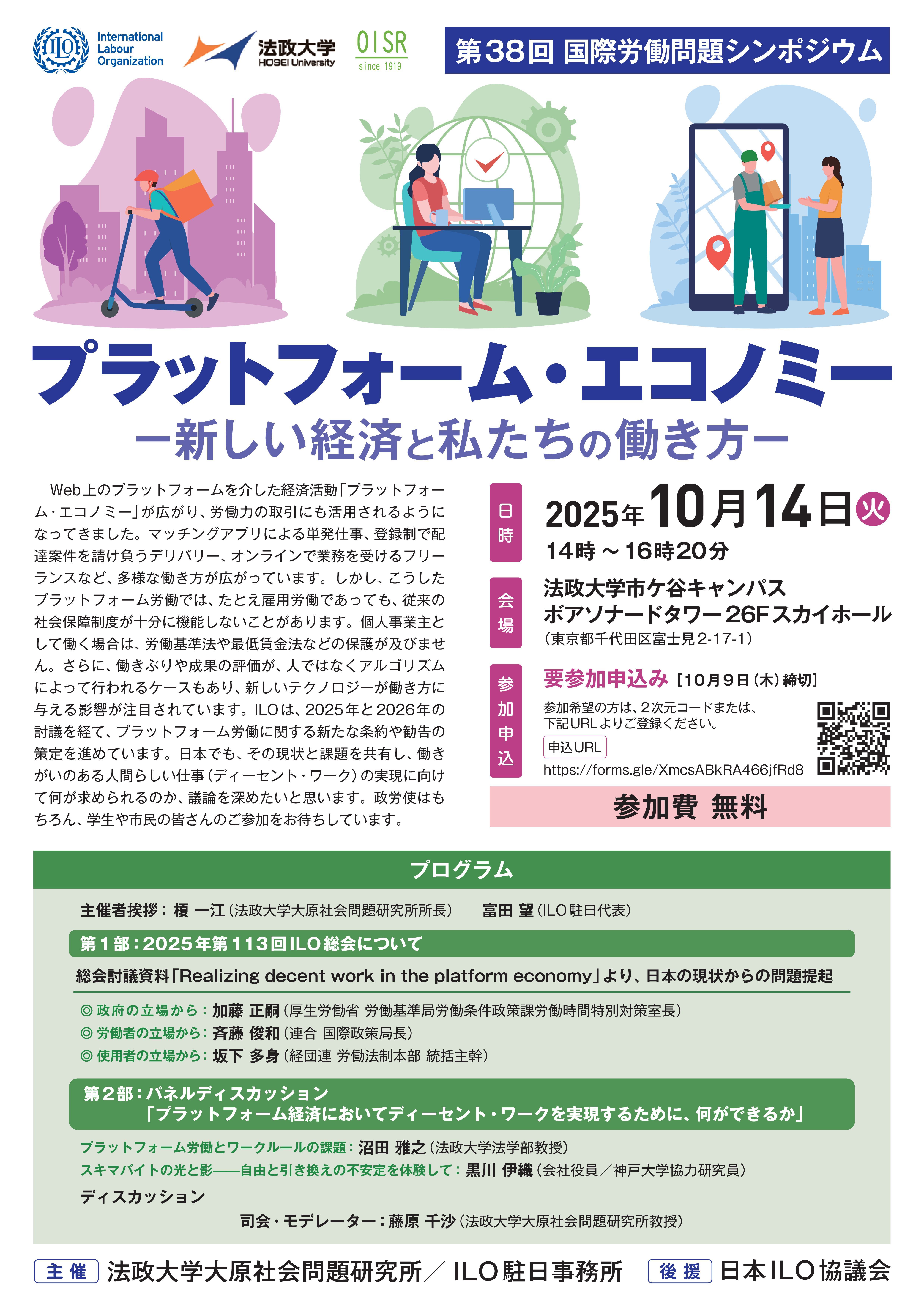法政大学大原社会問題研究所(東京都町田市/所長:榎 一江)は、2025年10月14日(火)に第38回国際労働問題シンポジウム「プラットフォーム・エコノミー 新しい経済と私たちの働き方」(主催:法政大学大原社会問題研究所・ILO駐日事務所/後援:日本ILO協議会)を法政大学市ケ谷キャンパスにて開催します。