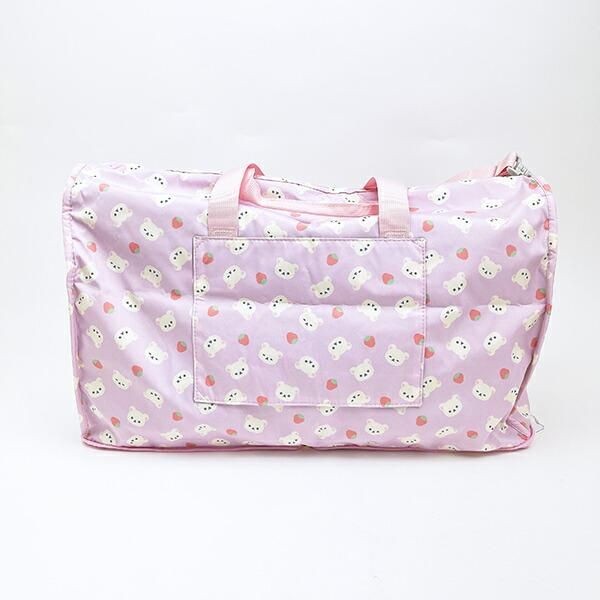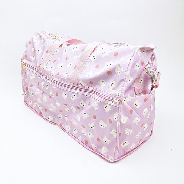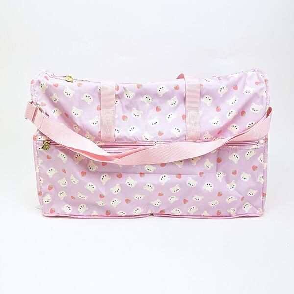 なかなかの大容量サイズで普段使いから旅行用まで、幅広く活躍しそうな予感です。コリラックマといちごがバッグいっぱいにデザインされ、どこから見ても癒しすぎます、、!サイズ:34cm×55cm×23cm 素材:ポリエステル