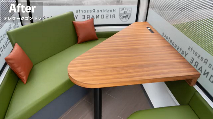 太陽の光に照らされた紅葉が美しい秋のリゾナーレ八ヶ岳に、トラックに乗ってアルツ磐梯から到着したゴンドラ。ひとつひとつ、ピーマン通りの広場に運び込まれます。朝には何もなかった広場に、夕方にはあっという間にテレワークゴンドラが設置されます。内装は、8人乗りだったゴンドラのベンチから、ゆったりと座れるソファに変更。資料や仕事アイテムを広げられる十分な広さのデスクを備えました。スキー場で活躍していたゴンドラが、リゾナーレ八ヶ岳で「テレワークゴンドラ」として誕生しました。