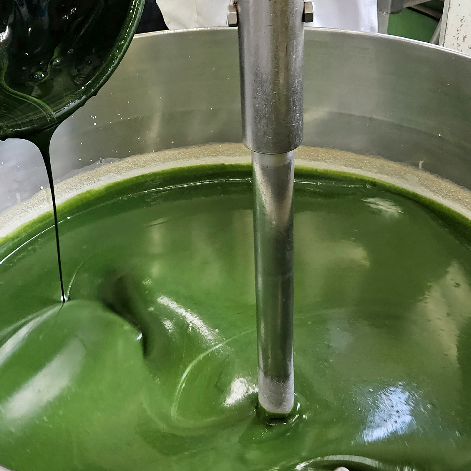 なめらかな口当たりにするために、抹茶はふるい、水あめの中に少しずつ手作業で攪拌。鮮やかな緑色と香りをいかすため、抹茶は仕上げ直前に混ぜ合わせ、クリーミーな硬さになるまで時間をかけて濃縮しました。
