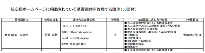 北海道ドローン協会は、2021年3月1日付けで無人航空機の講習団体に定期的な監査等を行う「管理団体」に認定され、航空局ホームページに掲載されました。