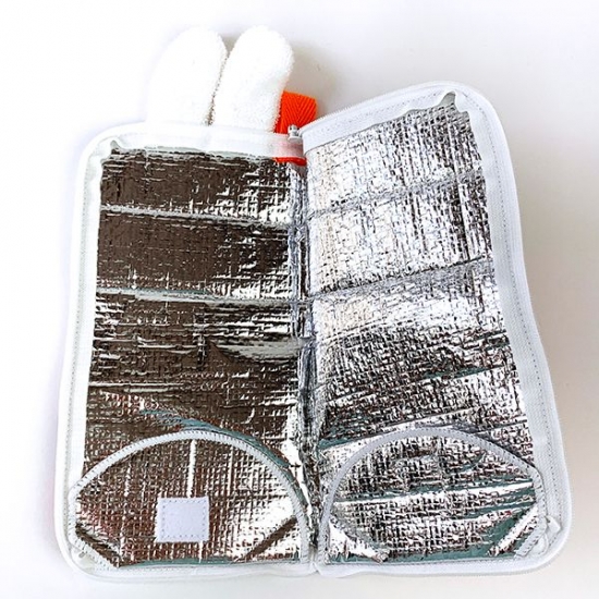 底を作るとスタンドタイプになるドットポーチです。中が保温タイプになっているので、ペットボトルや缶が入れられます。