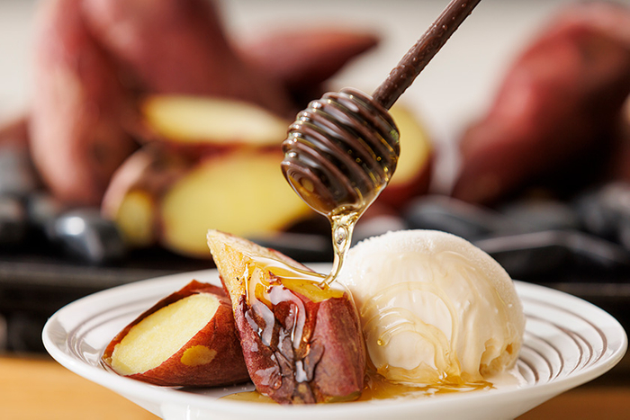 甘みの強い焼き芋とバニラアイスの組み合わせに蜂蜜を掛けて、濃厚な美味しさをお楽しみください。