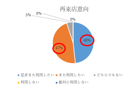 「是非また利用したい」と「また利用したい」を合わせると、実に95%の方が再来店意向をお持ちという結果を確認することができました。