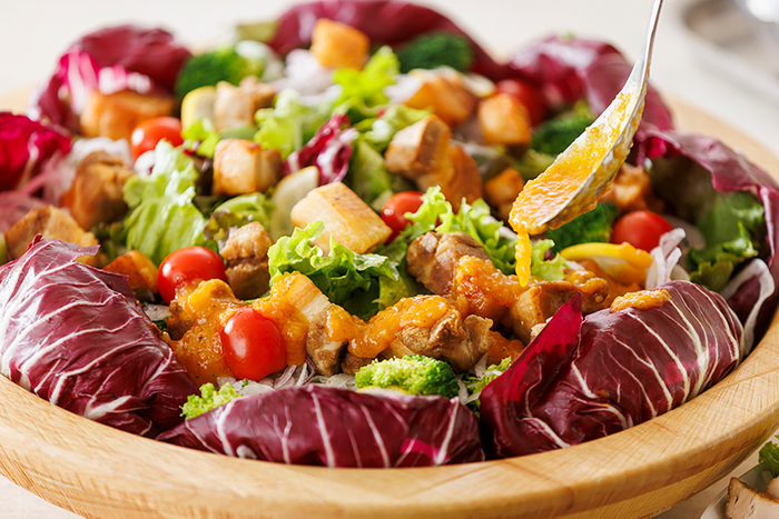 洋食メニュー「~人参ソースで~ごろごろポークステーキサラダ仕立て」。お肉と野菜をバランス良く楽しむことができる、女性にお薦めの一品です。