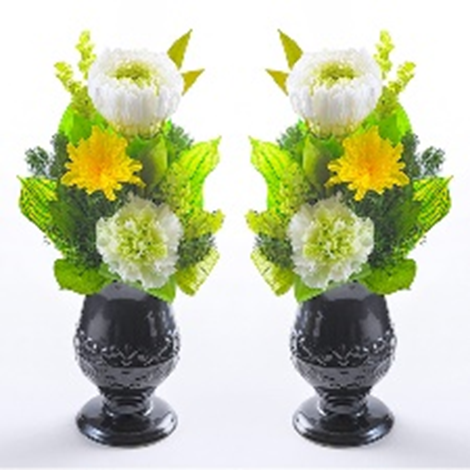 一対となる仏花は左右のバランスが大切なため、1つずつデザイナーが位置を確認しながら作っています。対でありながら現代風仏壇にも飾りやすいサイズ感です。※手持ちの花器にお好みの花、サイズで作るオーダーも好評です。