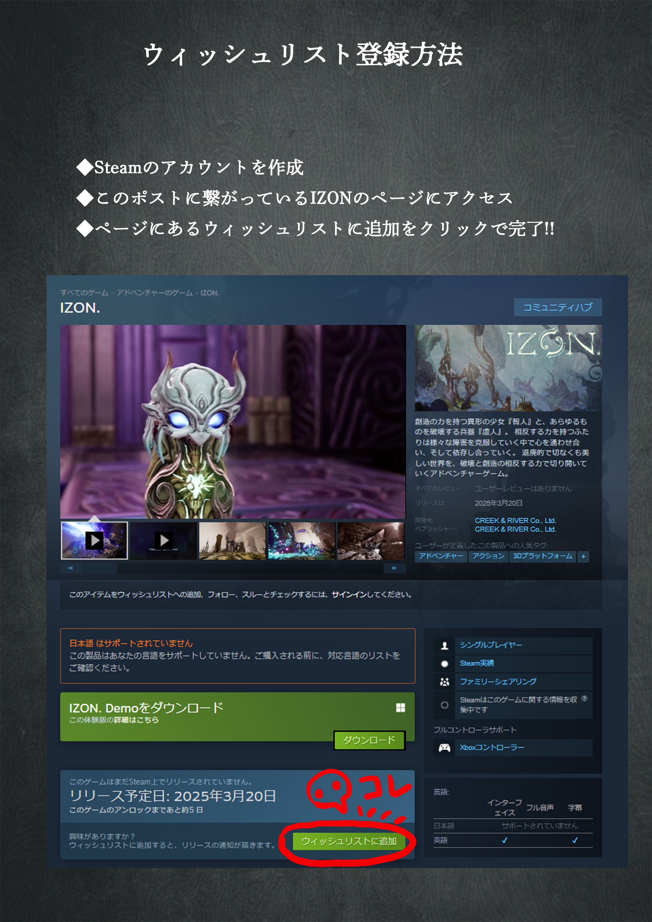該当のXのポストをリポストし、Steamの『IZON.』のページをウィッシュリストに追加した方の中から抽選で10名の方にプレゼントが当たります!