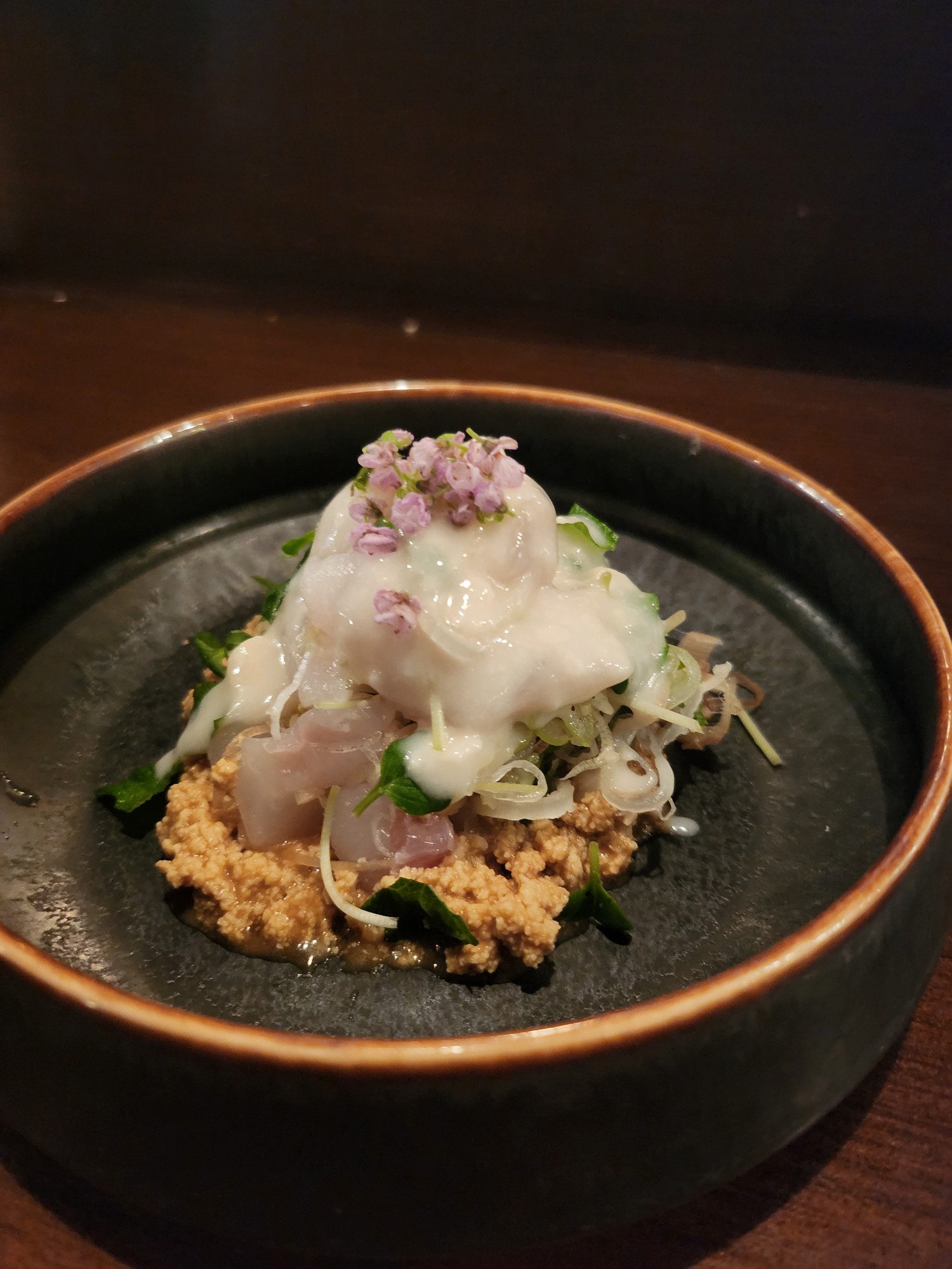 『陽乃鳥を掛けた白身魚香味野菜和え~フォアグラ醤油で~』