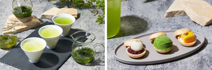 現在カフェで取り扱う緑茶から、静岡県産の掛川煎茶(深蒸し)、鹿児島産の霧島煎茶(中蒸し)、静岡県産の川根煎茶(浅蒸し)、三重県産のかぶせ茶の4種類の新茶を、産地ごとに順次販売します。今の季節しか味わうことのできない、新茶ならではのフレッシュで新鮮な甘みや旨味を感じてみてください。