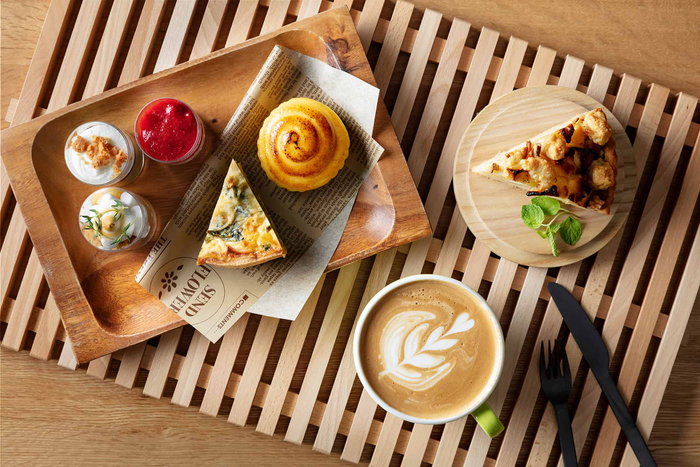 BEB5軽井沢は、24時間利用可能なパブリックスペース「TAMARIBA(タマリバ)」を中心に、時間を気にせず気軽に過ごすことができるホテルです。TAMARIBAは、ウッドデッキの中庭を取り囲むようにカフェやライブラリーが配置され、電源付きのテーブルや無料のWi-Fiが利用できます。TAMARIBAで仕事をし、一息つきたい時には BEB5軽井沢のカフェメニューがおすすめです。食べ応え十分のキッシュやカフェラテなどがカフェカウンターでオーダーできます。プラン特典として、ソフトドリンクは何杯飲んでも無料です。