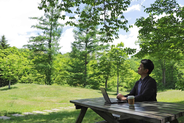 星野エリアでは、森の木々を眺めたり、木漏れ陽の下で川風を感じたり、野鳥のさえずりに耳をすませたり、テレワークに最適なスポットがあります。「ハルニレテラス」のカフェテラスや、「ピッキオ野鳥の森ビジターセンター」に併設された「イカルカフェ」で、軽井沢の自然を感じながら仕事に打ち込めます。