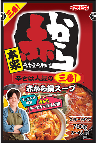 「赤から」の店舗で人気の「赤から鍋三番」の味を忠実に再現し、「辛さを極めたやみつきの旨さ」を楽しむことができます。また、キャンペーンに合わせて、リュウジさんの写真と「赤からチーズタッカルビ鍋」を大きく訴求したインパクトのあるデザインのパッケージを、数量限定で発売します。