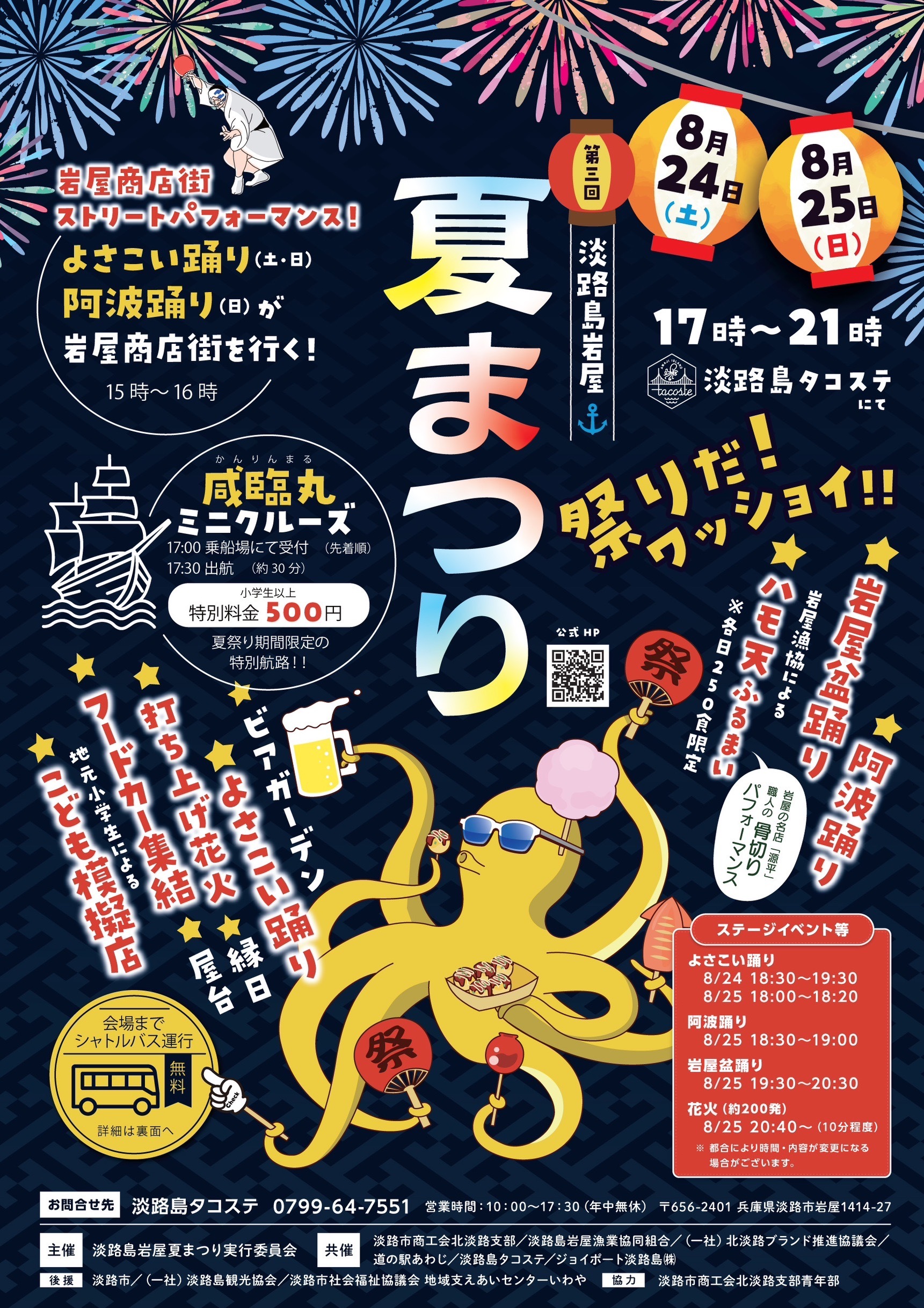 兵庫県淡路市岩屋に位置する観光複合施設「淡路島タコステ」が、2024年8月24日(土)と25日(日)に『第3回淡路島岩屋港夏まつり』を開催します。淡路島の夏の風物詩「鱧天振る舞い」から始まり、咸臨丸ミニクルーズや帆船咸臨丸の船内無料開放など、見どころ満載のイベントが目白押しです。地元の小学生による模擬店や、岩屋商店街でのストリートパフォーマンスも楽しめます。さらに、200発の打ち上げ花火が夜空を彩り、夏の思い出を一層華やかに演出します。