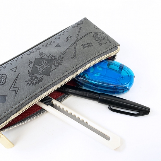 3つ目は、こちらの黒のレザー風ペンケースです。ポーチと同様のデザインがプリントされていますね。サイズは、6×18.5×3.5㎝です。ペンケースにしては少し小さ目ではありますが、その分持ち運びがしやすいですよ。