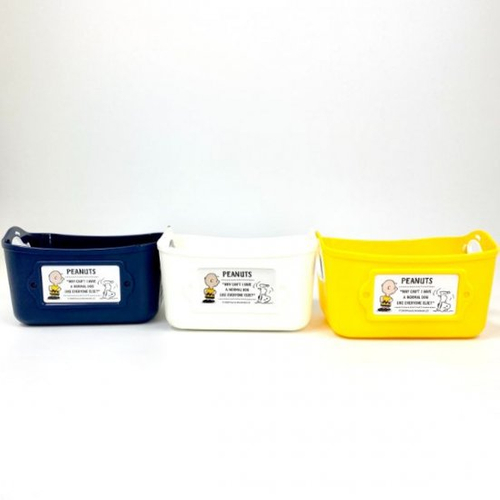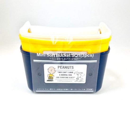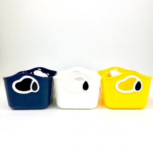 スヌーピーのミニサイズのやわらかバケツに新色が入荷中。白・ネイビー・イエローの3色がセットになっています。
