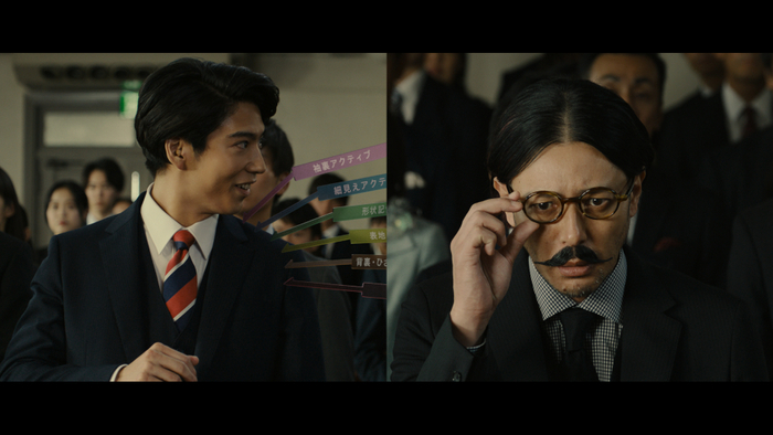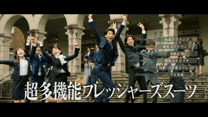 今回の新CMで2人が登場するのは大学の入学式。ターゲットの若い男性をマークするため、スーツ姿の 2人が親子に扮して式に潜入します。ストーリーが進むにつれて、探偵としての本来の任務から大きく外れていく予想外の展開と、先輩であるオダギリジョーさんと後輩である賀来賢人さんのコミカルなやり取りが見どころです。CMではストレッチ・形状記憶・脇消臭などの様々な機能性を備えたフレッシャーズ向けの多機能スーツを訴求しています。今回のCMはTV向けの15秒Verに加えて、WEB限定の30秒Ver・メイキング動画を用意しています。