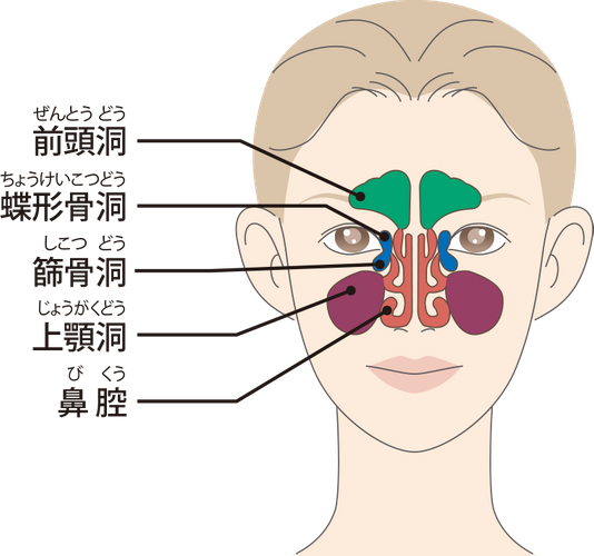 私たちの鼻腔は“副鼻腔”と呼ばれる鼻腔から繋がる空洞がいくつかあります。