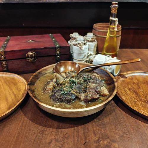 「旅人のシチュー」 は牛すね肉を黒ビールで煮込んだ逸品。その他、「ポレンタ」(揚げたトウモロコシ生地)、「粗挽き肉団子のスパイス焼き」 などが楽しめます。