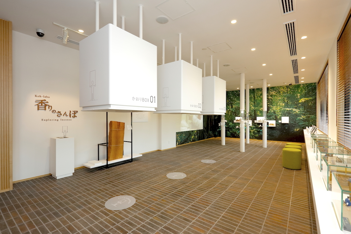 開設以来、様々な香りにまつわる展示を行なっており、現在では年間来場者数10万人以上を数えるほどになりました。展示スペースKoh-labo「香りのさんぽ」では、天井から吊り下がっている箱に入って様々な香りを体感できる「かおりBOX」や、お線香の製造工程のミニチュアの展示に加え、お香のガチャガチャ「薫ガチャ」も好評です。