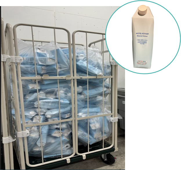 ホテル京阪では、脱プラスチックの取り組みを進めており、客室内のミネラルウォーターを従来のペットボトルではなく、アルミ付き紙容器で提供しています(一部店舗を除く)。容器使用後の取扱いについては、これまでは回収や輸送、再生製品化に係るオペレーションやコストに関しての課題があり、結果として、一般廃棄物として処理されていました。