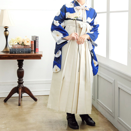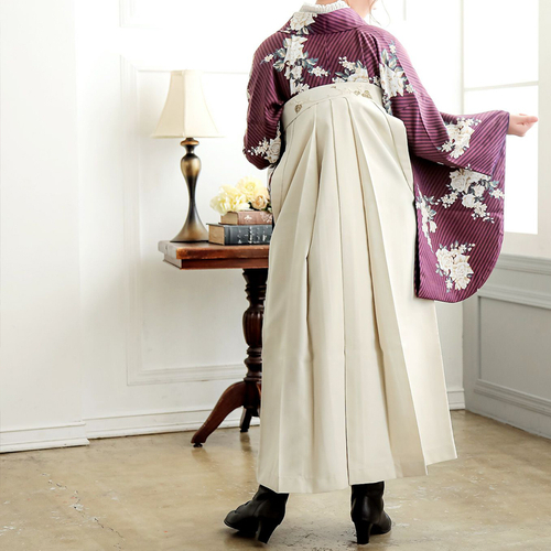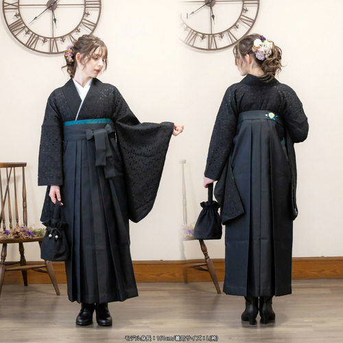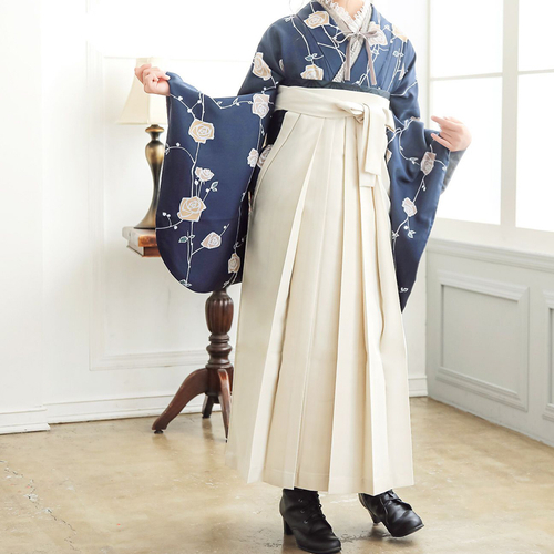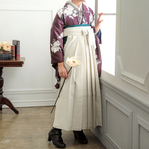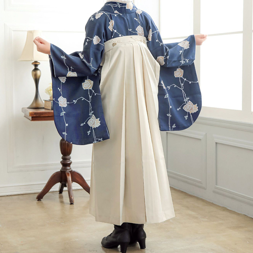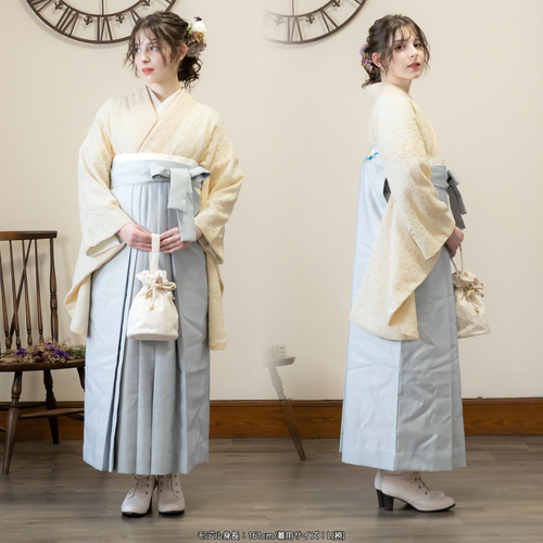 卒業式の袴スタイルにぴったりなレース二尺袖着物と椿刺繍の袴に、帯と襦袢もついた4点セットです。二尺袖は、まるでレースのワンピースのような清楚な雰囲気で、袴と合わせて着付けやすい短丈タイプです。袴は、腰の部分の椿の刺繍がかわいい、後ろ姿が自慢の袴です。草履はもちろん、ブーツを合わせたモダンな着こなしにも。行燈袴(あんどんはかま)で中仕切りのないスカートタイプ。袴の生地はお手入れしやすいポリエステル素材です。