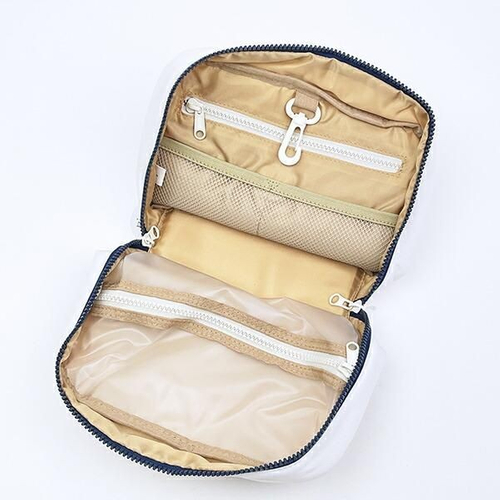 中には吊り下げフックが収納されており、お出かけの際に吊り下げて便利にお使いいただけます。内側にはポケットやゴムベルト付きの収納があり、細かく分けてしまうことができるのもうれしいポイントです。