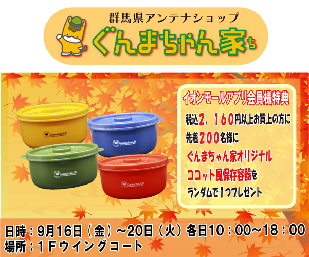 出張ぐんまちゃん家(群馬県物産展)にて、税込2,160円以上お買い上げいただき、イオンモールアプリのクーポンを利用するとぐんまちゃん家オリジナル「ココット風保存容器」を1つプレゼント!色はネイビー、グリーン、イエロー、オレンジの4種類!