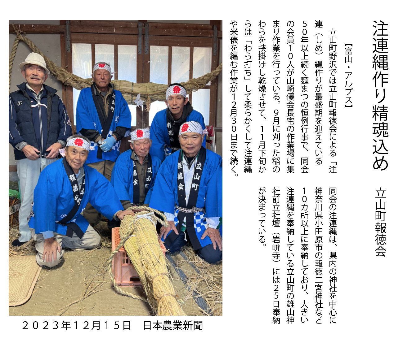 立山町報徳会に所属している農家ヒロシ。毎年年末に神奈川県小田原市にある報徳二宮神社へ我が家の稲藁から作られたしめ縄を奉納
