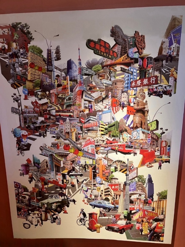 この作品は、アジア各地の風景や都市の象徴を重層的に組み合わせ、幻想的かつ賑やかな都市景観を描き出しています。細部にまでこだわり、異文化が交差する「旅の記憶」を呼び起こすような、その奥行きあるビジュアルは、訪れる人々に「食べながら旅をする」ような没入体験をもたらしてくれます。