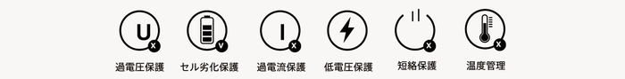 過電圧保護、セル劣化保護、過電流保護、定電圧保護、短絡保護、 温度管理、先進のバッテリーマネジメントシステム(BMS)を搭載し ています。