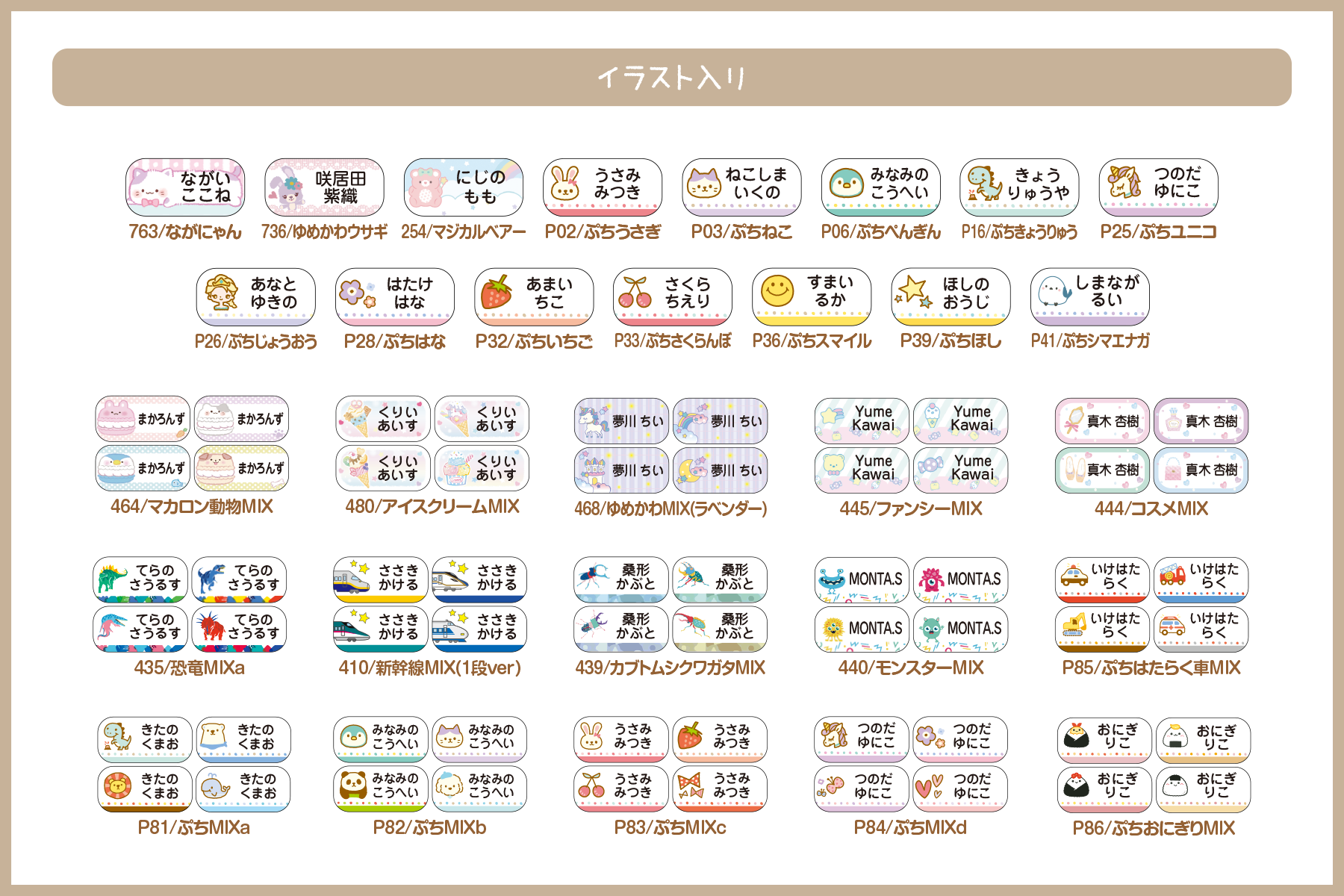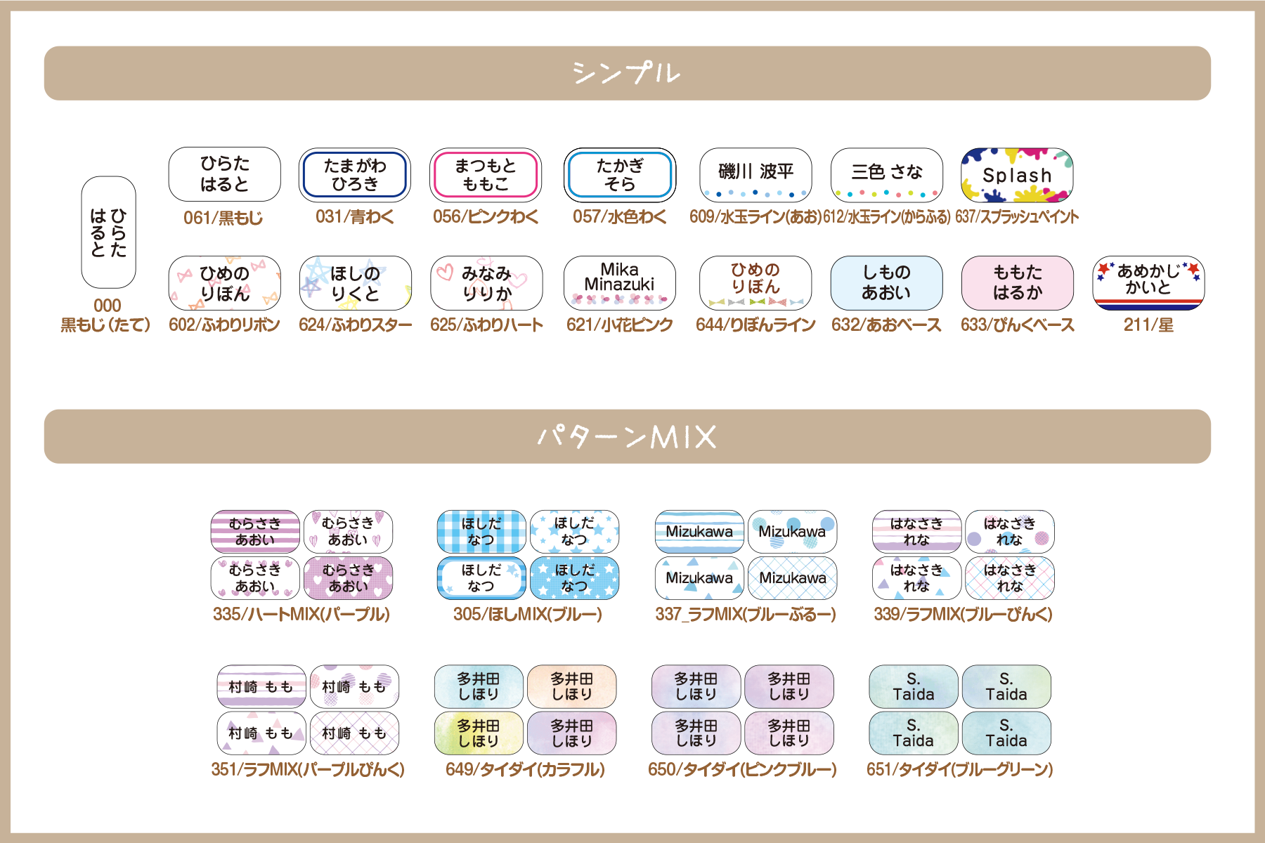 入園準備から小学校高学年まで使える、シンプル〜イラスト入りの70デザインをご用意。特に小学生に人気のデザインから厳選したデザインをセレクトしました。1種類ですが縦文字もご用意しています。