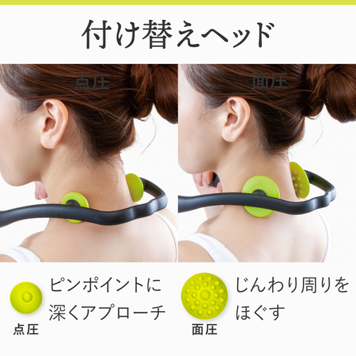 スマホやPCで凝り固まった首を挟んで揉み上げてめぐりUP。じんわりほぐす面圧と深い刺激の点圧で切り替え可能で押圧部分を変えられます。