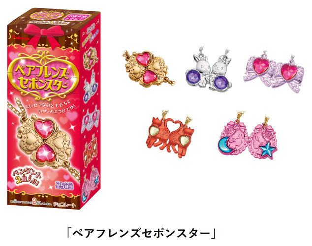 「セボンスター」は1979年に発売した、カバヤ食品のロングセラーのアクセサリー玩具菓子です。定番シリーズの六角形のパッケージは、40年を超える今も変わりません。キラキラしたかわいいデザインとシリーズごとに異なるデザインモチーフは、コレクション性とアレンジ性が高く、女の子たちだけでなく、キラキラの世界観に魅せられた大人の女性にも人気があります。現在は、ペンダントトップがペアセットになった商品『ペアフレンズセボンスター』も発売しております。