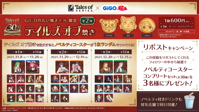 GiGOのたい焼き渋谷にて『テイルズ オブ』シリーズの各タイトルで活躍するマスコットキャラクターのうち、「テイルズ オブジアビス」より「トクナガ」、「テイルズ オブ エクシリア2」より「ルル」、「テイルズ オブ ゼスティリア」より「ノルミン」をモチーフにした「テイルズ オブ焼き」を販売いたします。「テイルズ オブ焼き」を1点ご購入につき、オリジナルコースターをランダムで1枚進呈いたします。