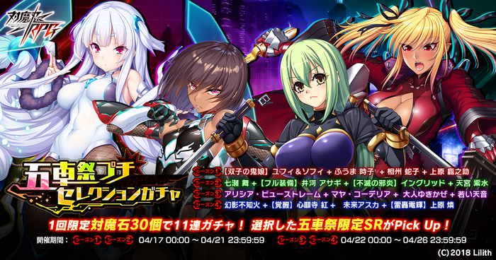 株式会社インフィニブレイン(本社:大阪市中央区、代表取締役:武山 英治)は、オンラインゲームプラットフォーム「DMM GAMES」( https://games.dmm.com/ )にて配信している、近未来くノ一ロールプレイングゲーム『対魔忍RPG』は、4月17日(月)より限定ユニットを獲得できる五車祭SR確定ガチャなどをお知らせいたします。