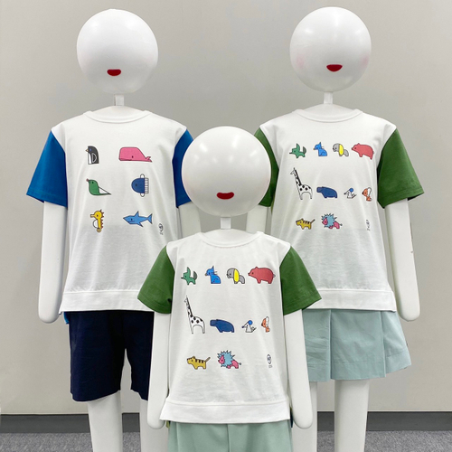 キツネ、ネコ、イヌ、クマ、キリン、サイ、ネズミ、コアラ、トラ、ライオンの10種類の動物がプリントされています。袖と後ろ身頃は、陸をイメージした黄緑とグリーンにしました。