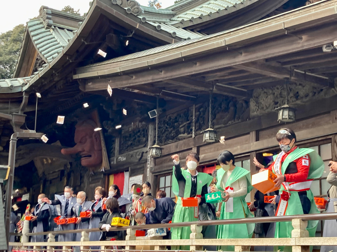 急遽参加となった北山は、自身が八王子観光大使を務めるゆかりの地で、地元ファンを前に笑顔で勢いよく豆を巻いた。この日は、多数のファンも参拝。舞台を取り囲むように黒山の人だかりをつくった。