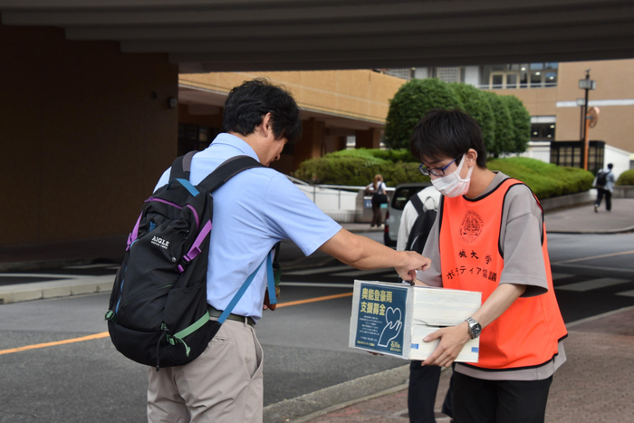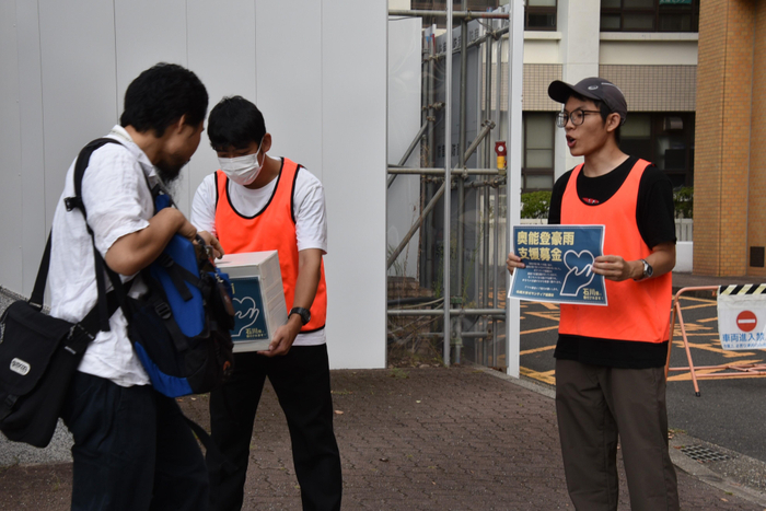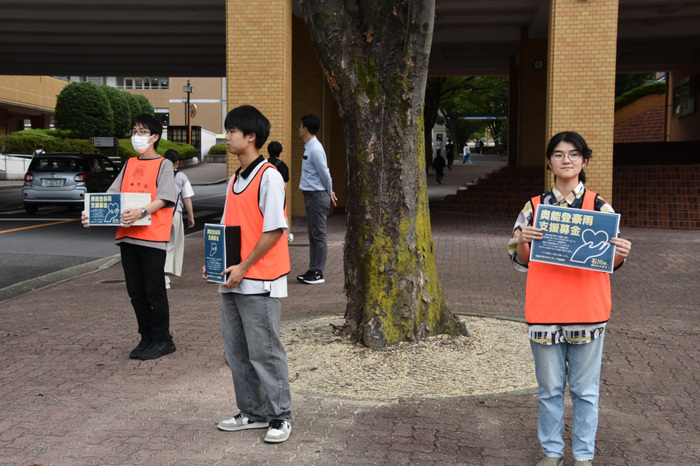 天白キャンパスでは本部棟下と共通講義棟東付近に分かれて午前8時半ごろから1限が始まるまでの間、オレンジのビブス姿のメンバー8人が募金箱などを手に、「豪雨災害で被害を受けた方々支援するため、協力をお願いします」と呼び掛けると、学生や教職員が次々と応じていました。